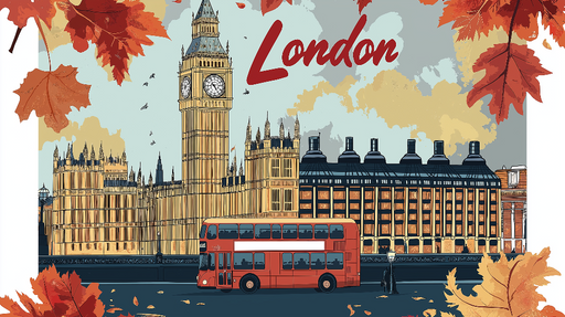 Teljes részletek megtekintéseFalfestmény tapéta London | Ikonikus illusztráció Londonról piros busszal és őszi levelekkel
