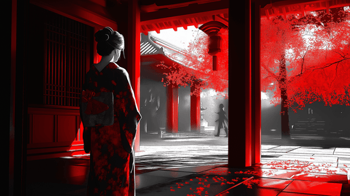 WonderMuralEz a lenyűgöző falfestmény egy érdekes jelenetet ábrázol: egy kimonós nő áll egy japán templom előtt, körülötte élénk lombozatú fák. A vörös árnyal...