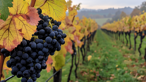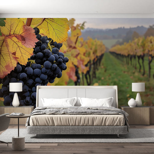 WonderMuralEz a lenyűgöző tapéta egy csodálatos tájat mutat be, ahol lágy fényben fürdő szőlőtőkék és tökéletesen érett fekete szőlőfürtök láthatók. A meleg ő...