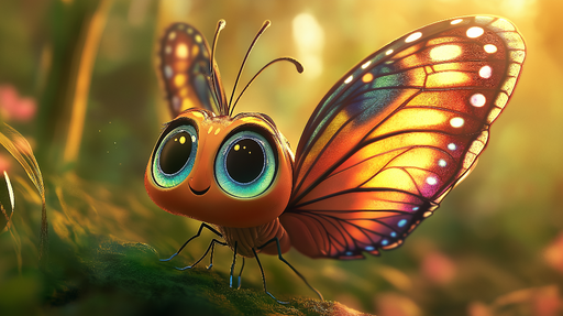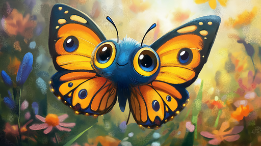 WonderMuralEz a bájos falfestmény tapéta egy aranyos animált pillangót ábrázol, nagy csillogó szemekkel és szárnyakkal, amelyek finoman árnyaltak narancs, sár...
