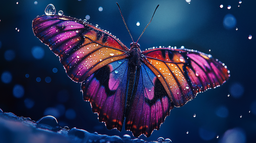 WonderMuralFedezze fel csodálatos pillangónkat, amely élénk színek átmenetét mutatja a lilától a narancsig, csillogó vízcseppekkel megvilágítva. Ez a magával ...