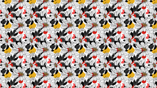 Teljes részletek megtekintéseFotó tapéta virágos színes | Fehér virágok piros és sárga díszítéssel és grafikus mintákkal