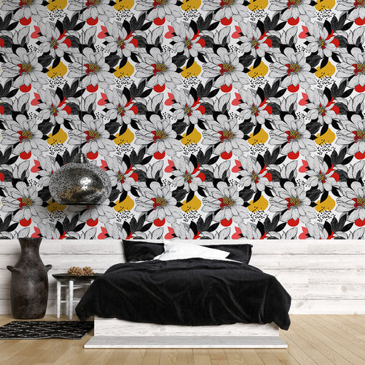 WonderMuralEz a tapéta kiemelkedik a élénk virágos mintájával, amelyet piros, sárga, fekete és fehér virágok alkotnak, és vidám és ünnepi hangulatot teremtene...