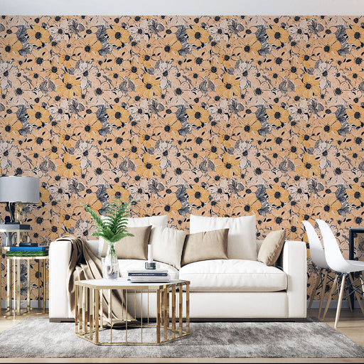 WonderMuralFedezze fel Mural Wallpaperünket fényes virágmintával, ahol sárga virágok és fekete érintések virágzanak egy finom őszibarack háttéren. Ez a kompoz...