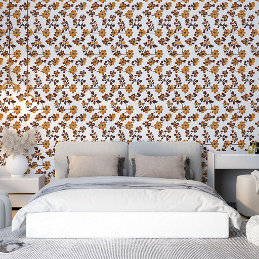 WonderMuralA gyönyörű fotó tapétánk finoman rajzolt kis sárga virágok mintáját mutatja, barna levelekkel kísérve világos háttéren. A színek harmóniája meleg ...