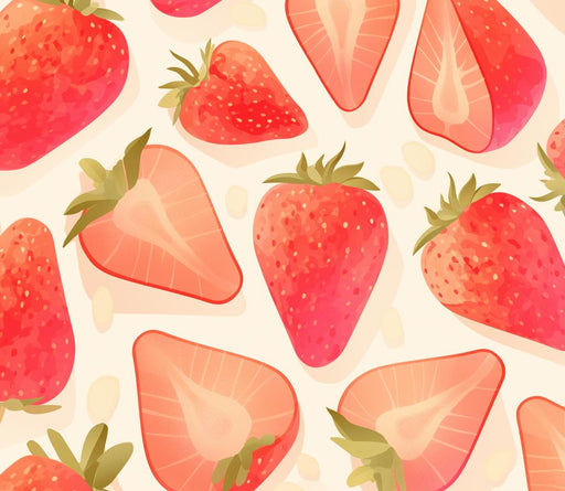 Solar ArtEz a kedves tapéta élénk piros eper mintázatot mutat puha háttéren. A gyümölcsök aprólékos részletei, a zöld levelekkel és aranyszínű magokkal, fri...