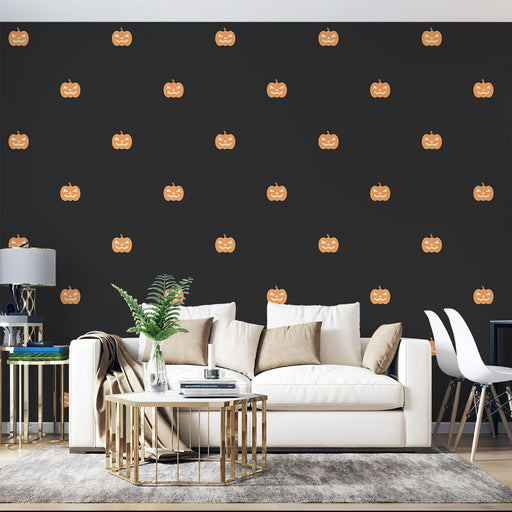 Studio SamaA tökös tapéta ideális egy ünnepi és hátborzongató Halloween hangulat megteremtéséhez. Egy fekete háttéren kis narancssárga tökök ijesztően faragot...