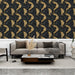 Impozáns Tapete funkcionál egy kifinomult mintázatú arany tollakkal, melyek hullámzanak egy mély fekete háttéren, így lenyűgöző kontrasztot teremtve, ami megragadja a tekintetet. A tollak finoman kidolgozott részletei luxust és eleganciát hoznak a térbe.