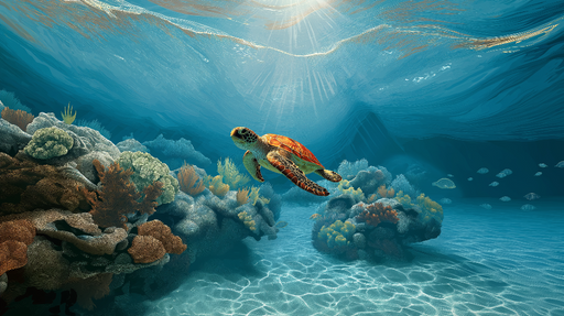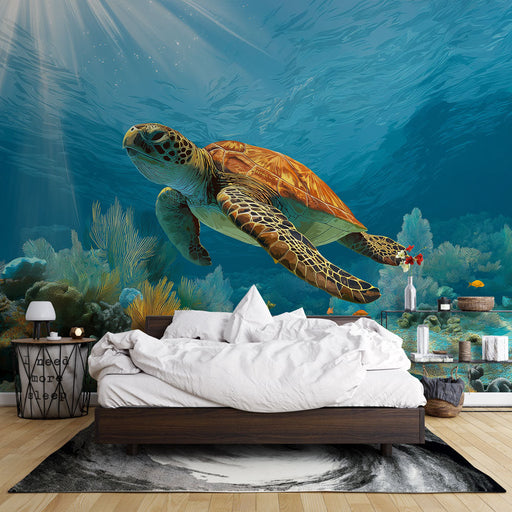 WonderMuralEz a fotó tapéta elmerül egy lenyűgöző víz alatti világban, ahol egy kecses tengeri teknős úszik a sokszínű korallzátonyok között. A világoskék árn...