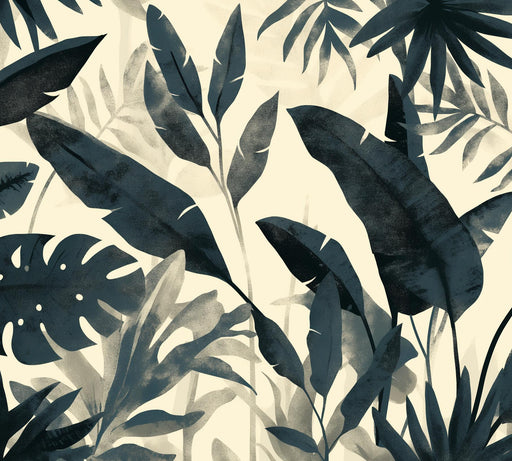 MistyEz a tapéta Tropical Foliage with Midnight Blue Leaves buja mintázatot mutat nagy egzotikus levelekkel fekete (árnyékok) és sötétkék árnyalatokban....