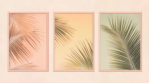 WonderMuralTapétánk gyönyörű dizájnt kínál pálma levelekkel, melyeket három keretbe helyeztünk el finom színekben. A rózsaszín, barack és zöld árnyalatai harm...