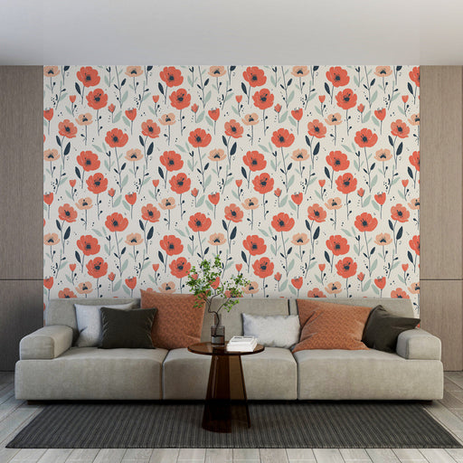 Teljes részletek megtekintéseVadvirág tapéta | Vörös szirmok és lágy zöld levelek világos háttéren