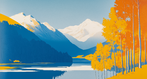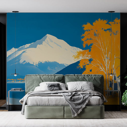 WonderMuralŐszi hegyek Ez a tapéta lenyűgöző hegyi tájat ábrázol, ahol a mélykék tónusok gyönyörűen kontrasztálnak az arany őszi fákkal. A havas csúcsok kieme...