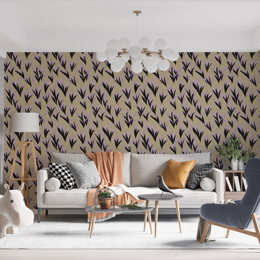 WonderMuralA tapétánk egyedi fekete és lila színű stilizált levelekkel díszített, amelyek elegánsan emelkednek egy puha bézs háttérrel szemben. A színkombinác...