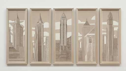 WonderMuralEz a fotó tapéta egy gyönyörű utánzat festményt mutat be egy sor stilizált felhőkarcolóval bézs és fehér árnyalatokban. A illusztráció egy modern v...