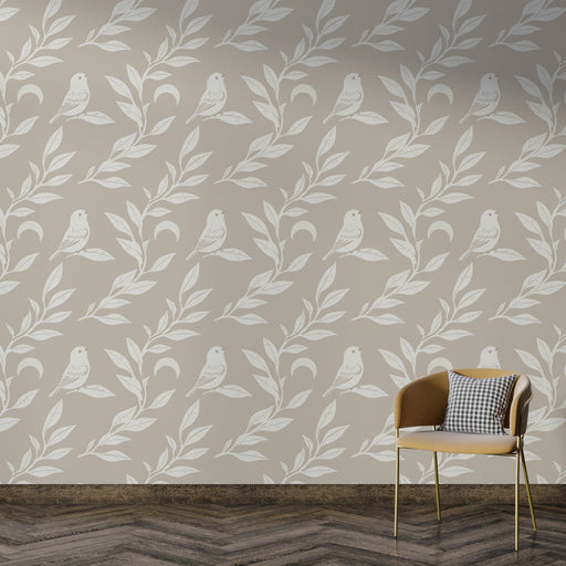 WonderMuralEz a bájos tapéta egy finom mintázatú kis fehér madarakat és fészkeket ábrázol, amelyeket kézzel rajzoltak, harmonikusan elrendezve egy bézs háttér...