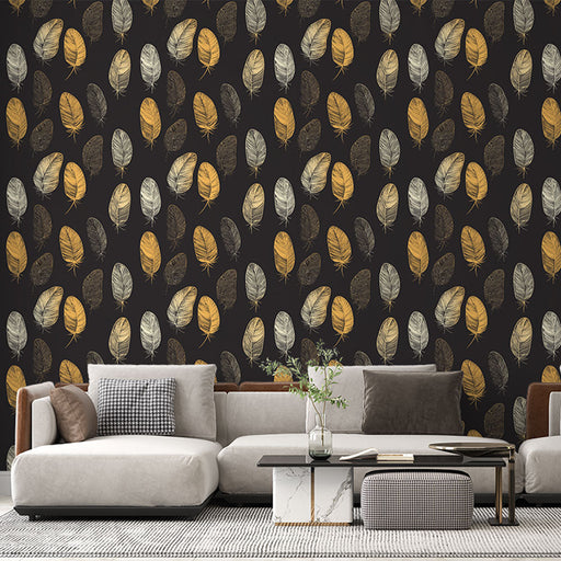 WonderMuralA Mural Wallpaperunkban egy gazdag mintázatú aranyszínű tollak finoman rajzolva, elrendezve egy mély és elegáns fekete háttéren. Az arany árnyalata...