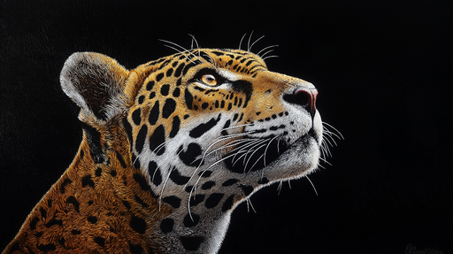 Teljes részletek megtekintéseFalfestmény jaguar | Egy jaguár fenséges portréja fekete háttérrel