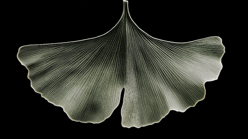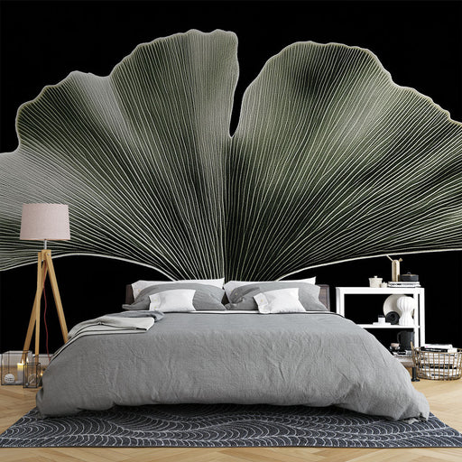 WonderMuralEz az egyedülálló tapéta egy gyönyörűen részletezett gingko biloba levelet emel ki, mély fekete háttéren bemutatva. A levél finom vonalai és textúr...