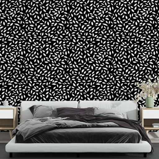 WonderMuralExkluzív Tapete mutatja egy lenyűgöző minta a fehér levelek finoman szórva egy intenzív fekete háttér, létrehozva egy feltűnő kontrasztot. A dinami...