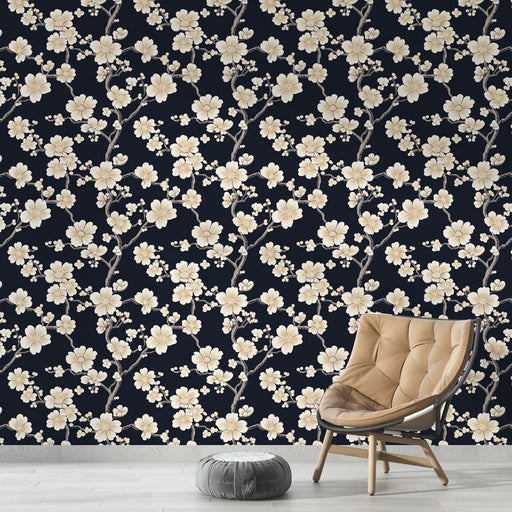 WonderMuralEz a kifinomult fotótapéta finoman rajzolt krémszínű virág mintával rendelkezik, mely összefonódik egy sötétkék háttérrel. A gallyak és rügyek fino...