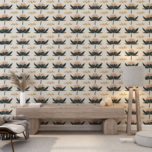 WonderMuralBeautiful Mural Wallpaperunk jellegzetes virágokkal finom szirmokkal, arany levelekkel egy puha krémszínű háttéren. A fekete, rózsaszín és arany ár...