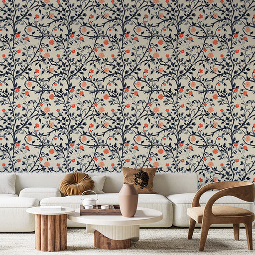 WonderMuralEz a tapéta egy szép mintázatú finom virágokkal díszített koral háttéren. A fekete illusztrációk feltűnő kontrasztot alkotnak a háttér meleg árnyal...