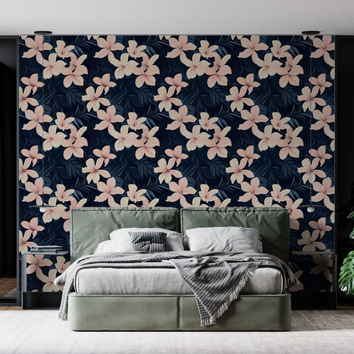 WonderMuralEz a tapéta finom virágos mintával rendelkezik pasztell virágokkal sötétkék háttéren, elegáns és nyugtató hangulatot teremtve. A bézs és zöld lágy ...