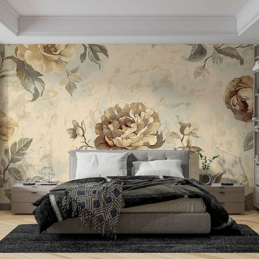 WonderMuralEz a falfestmény tapéta egy finom virágmintát mutat be, amely meleg árnyalatú rózsákat ábrázol, bézs és arany tónusokat kombinálva egy lágy háttére...