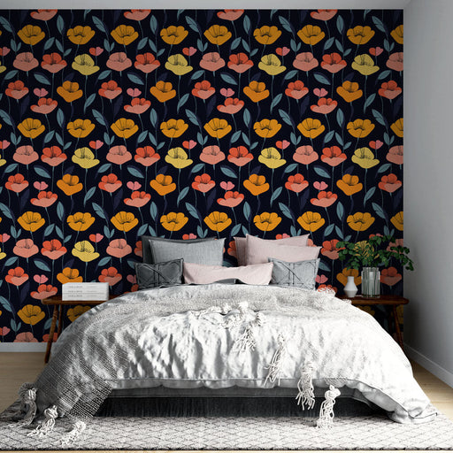 WonderMuralEz a tapéta egy bájos mintát hangsúlyoz stilizált virágokkal élénk vörös, narancssárga és sárga árnyalatokban, világos háttéren. A fekete szárak mo...
