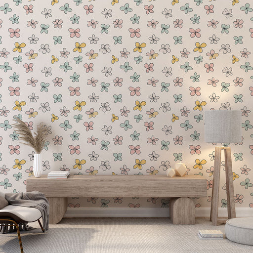 WonderMuralFedezze fel virágmintás tapétánkat, mely gyönyörű stilizált virágokat mutat be pasztell rózsaszín, sárga és kék árnyalatokban. A zöld levelek friss...
