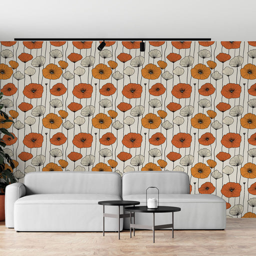 WonderMuralLenyűgöző Tapete termékünk merész narancssárga virágok finoman kiszínezett mintáját mutatja, bézs és fekete árnyalatokkal, amelyek mélységet és ele...