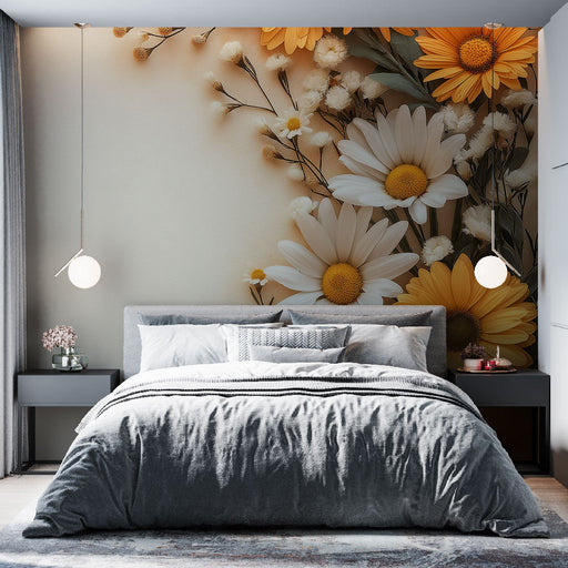 WonderMuralEz a falfestmény tapéta egy csodálatos virágmintát ábrázol fehér és sárga százszorszépekkel, finom szárakkal és apró virágokkal kísérve. A dinamiku...