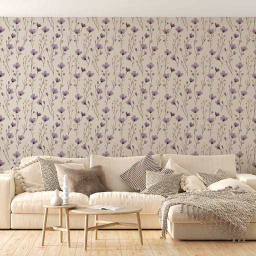 WonderMuralEz a finom tapéta egy mintázatot mutat kis lila virágokkal és finoman szórt virágos érintésekkel egy krém háttéren. Ennek a dizájnnak a könnyedsége...