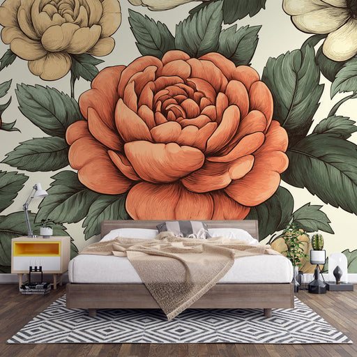 WonderMuralCsodálatos falfestmény tapétánk finom rózsamintát tartalmaz meleg narancs, krém és zöld árnyalatokban, romantikus és barátságos légkört teremtve. A...