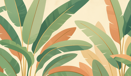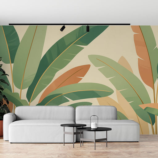 WonderMuralItt van egy lenyűgöző illusztráció, amely kiemeli a nagy trópusi leveleket, frissességet és egzotikusságot hozva a belső térbe. A zöld és sárga árn...
