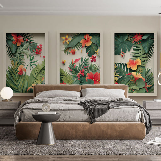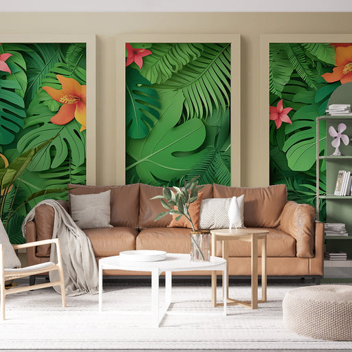 WonderMuralNagyított tapétánk kizárólagosan a trópusi növényzet dús kialakítását mutatja meg gazdag zöld palettával, élénk piros és narancssárga érintésekkel....