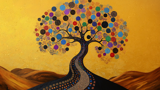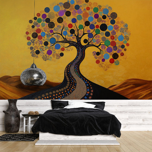 WonderMuralEz az egyedülálló falfestmény egy stilizált fát ábrázol karcsú ágakkal, amelyeket színes körök tarkítanak egy élénk aranysárga háttéren. Minden kör...