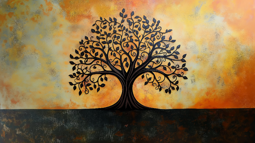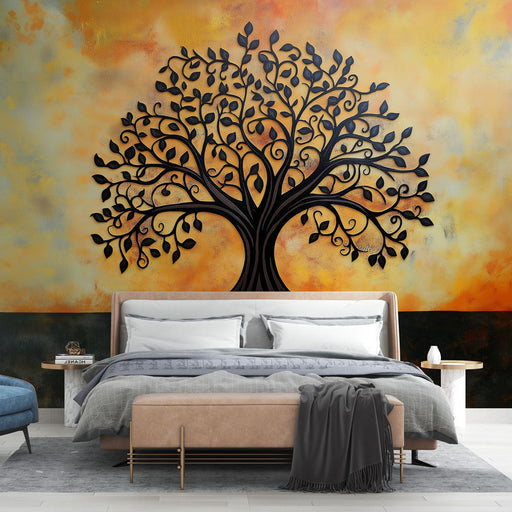 WonderMuralEz az egyedülálló falfestmény tapéta egy stilizált fát ábrázol fekete színben, elegáns és finom vonalakkal, amely kiemelkedik az arany és narancssá...