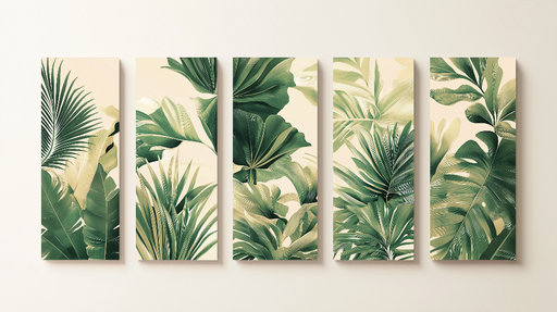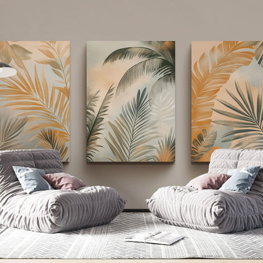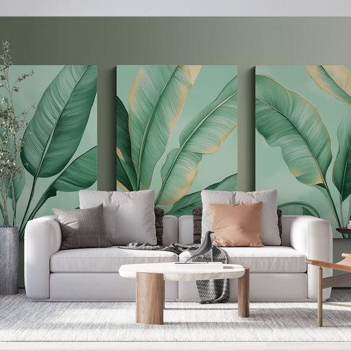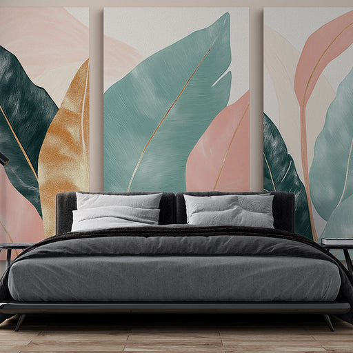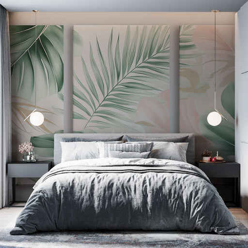 WonderMuralA mi Mural Wallpaperünk egy tropikus leveles motívumot ábrázol finoman festve, arany és zöld árnyalatok keverékével egy nyugtató pasztell háttéren....
