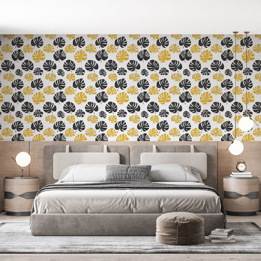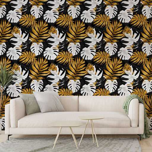 WonderMuralEz a trópusi tapéta elegánsan kiemelkedik arany, fehér és fekete levelek elegáns keverékével, modern és exotikus hangulatot teremtve. A változatos ...
