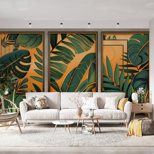 WonderMuralEz az ikonikus falfestmény tapéta stilizált trópusi levelek válogatását tartalmazza gazdag zöld és arany tónusokban, megidézve a természet eleganci...