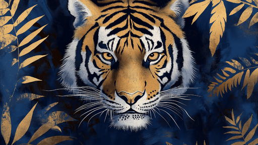 WonderMuralEz a lenyűgöző tapéta egy fenséges tigris portréját ábrázolja, arany levelekkel körülvéve mély kék háttéren. A tigris bundájának finoman kidolgozot...