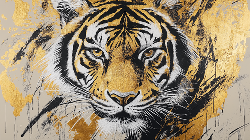 WonderMuralEz a lenyűgöző falfestmény egy fenséges tigrist ábrázol átható tekintettel, amelyet művészi arany és fekete érintések vesznek körül, amelyek a term...