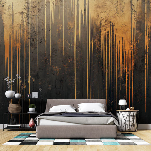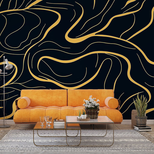 WonderMuralEz a falfestmény tapéta absztrakt és modern dizájnt mutat be, amely feltűnő arany vonalakkal zuhan végig egy fekete és arany háttéren. A feltűnő ko...