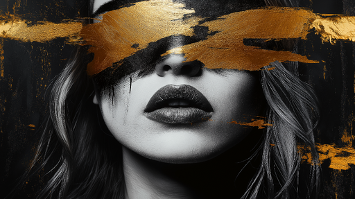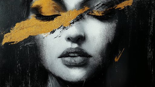 WonderMuralEz a lenyűgöző falfestmény egy női arcot ábrázol fekete és arany színekben, élénk festékfoltokkal kiegészítve. A sötét és arany árnyalatok használa...