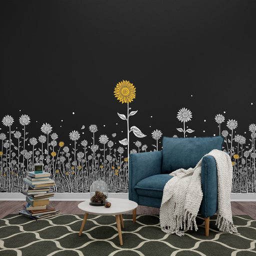 WonderMuralA tapétánk lenyűgöző mintájával kiemelkedik, finoman rajzolt sárga virágokkal, kifinomult szárral, mindez egy lenyűgöző fekete háttéren, amely kiem...