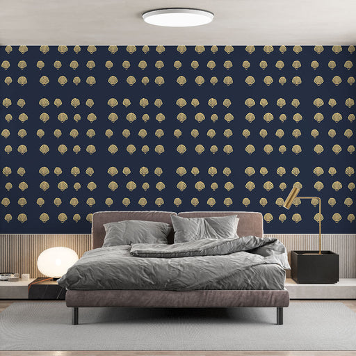 WonderMuralBeautiful exclusive mural wallpaperunk egy elegáns mintaarany kagylókkal finoman részletezve, virágzó gazdagsötétkék háttérrel. A színek kombináció...