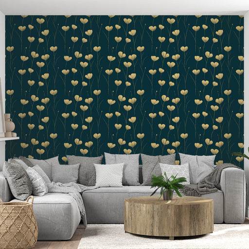 WonderMuralEz a elbűvölő fotó tapéta finom motívumokat mutat be, arany virágokkal, amelyek kecsesen virágzanak egy sötétkék háttér ellen, olyan hangulatot ter...