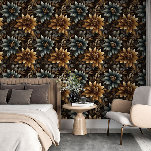WonderMuralFedezze fel gyönyörű fotótapetánkat, amely gazdag virágos mintával kombinálja a nagy arany és sötétkék virágokat. A sötét háttér kontrasztja kiemel...